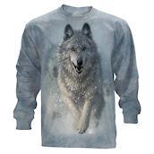 Meget flot og sødt motiv som viser en ulv i sneen. Billedet giver en rolig følelse og passer perfekt indenunder en blazer eller cardigan i kolde tider.