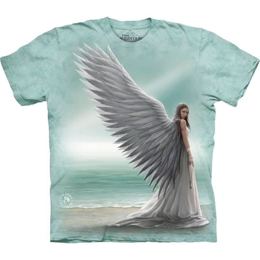 T-shirt med engel med store, hvide vinger på en lys tyrkis bagrund. En flot trøje i afdæmpede farver.