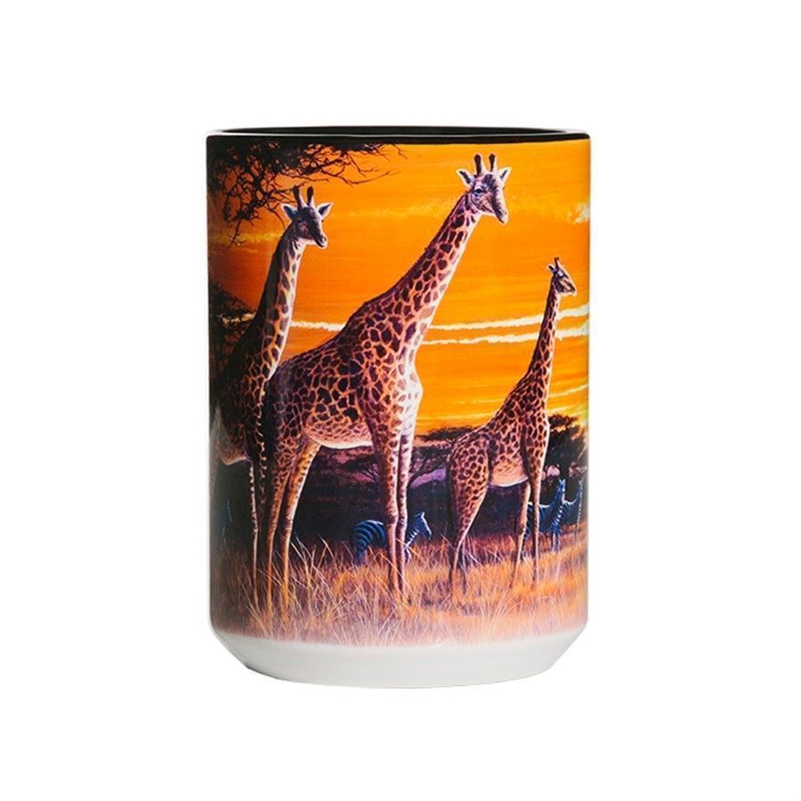 kaffekrus med girafferTekrus med giraffer på savannen i solnedgangens lys