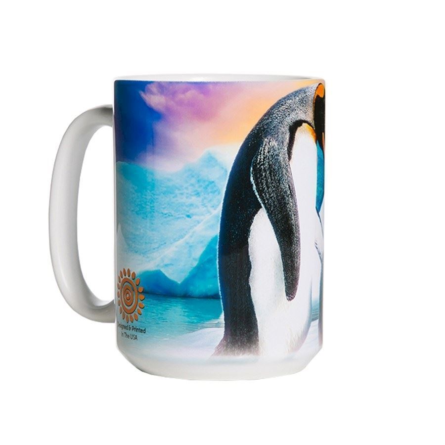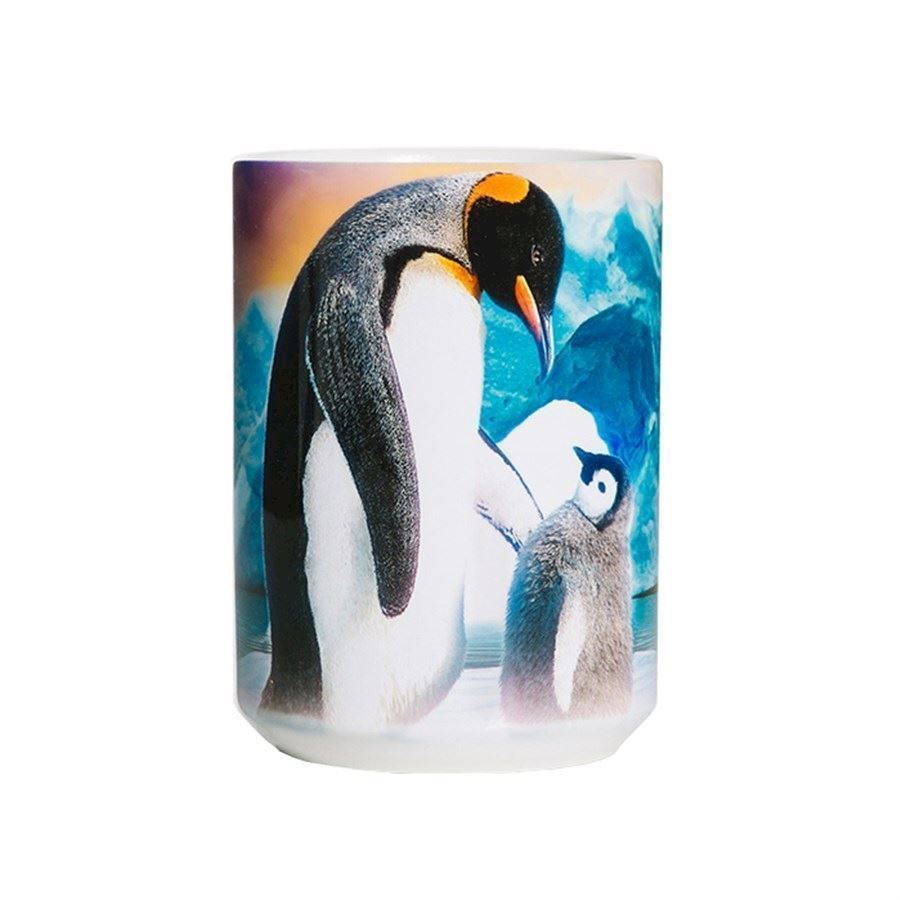 Kaffekrus med print af en lille kejserpingvinungeTekrus med motiv af kejserpingviner