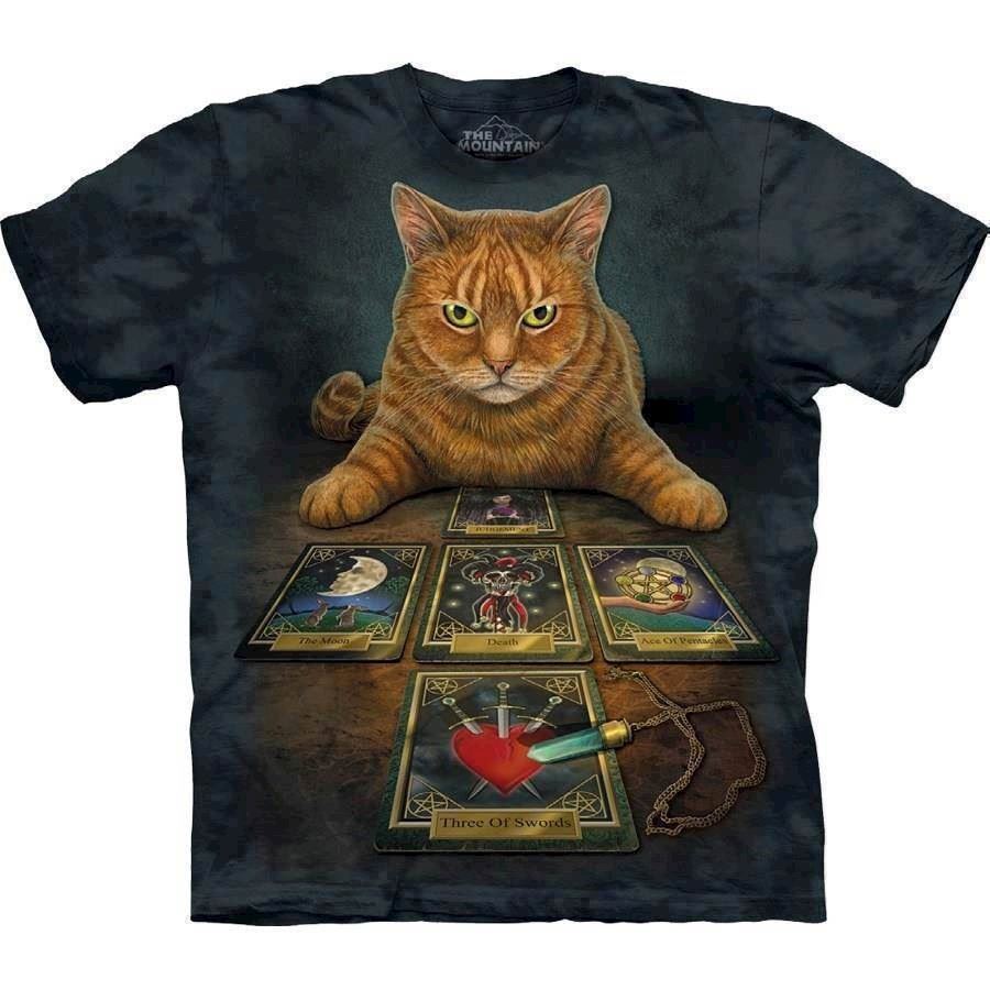 T-shirt med kat, der læser tarot-kort. Koksgrå trøje med kattemotiv, og så lidt magi.