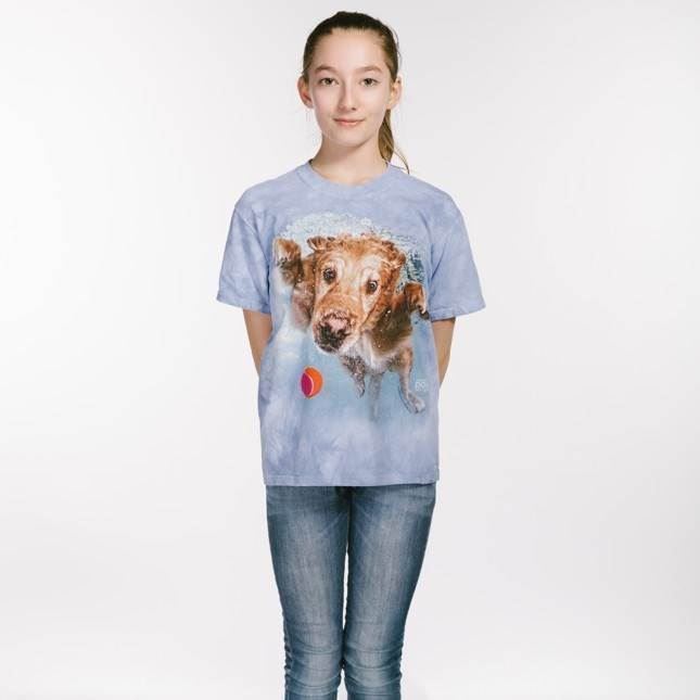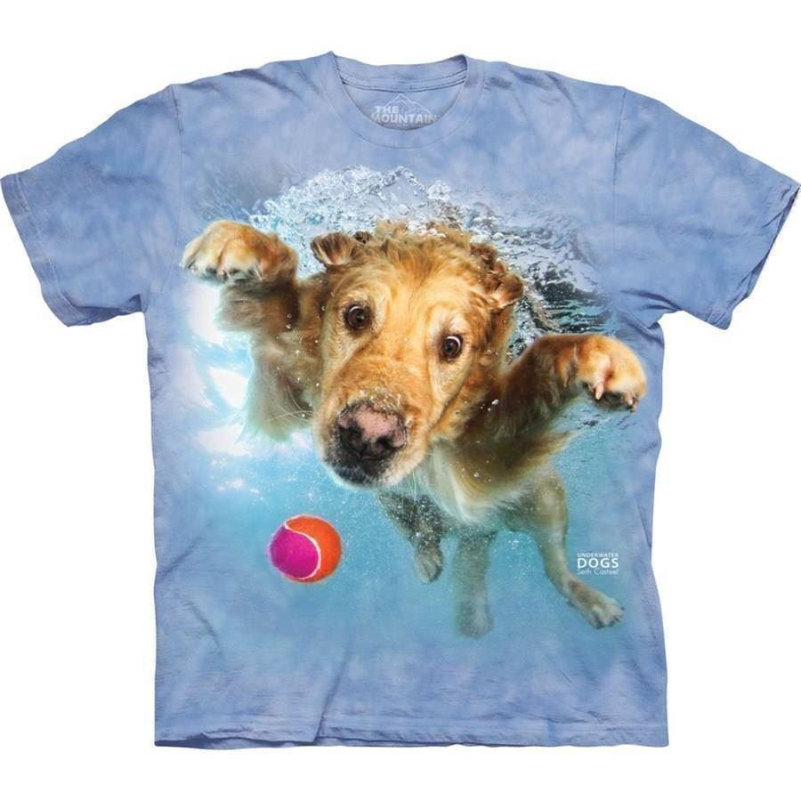 T-shirt med fotografi af en golden retriever der svømmer under vand