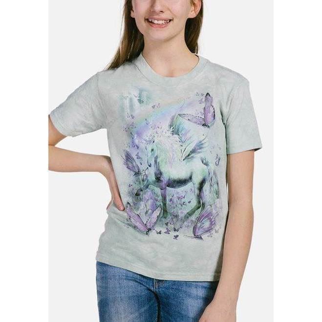 Dette motiv af en enhjørning, regnbue og sommerfugle, er sødt med sødt på. En hver pige vil kunne elske denne t-shirt med det super søde motiv.