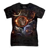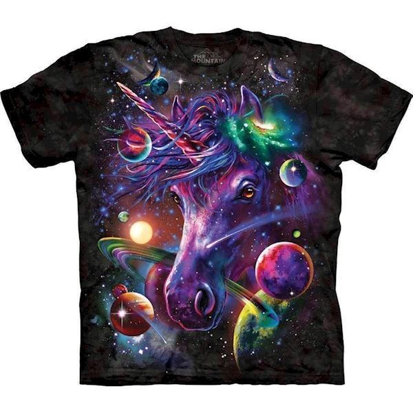 Kosmisk enhjørning i psykedeliske farver. Flot og farverig til farverige personer. En sort t-shirt med farveindsprøjtning, planeter, stjerner og universets uendelige dyb.