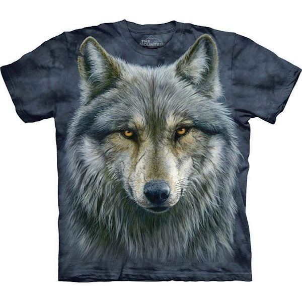 T-shirt med en ulv, der spejder ud fra trøjen. Flot stort motiv, motiv i hvide farver på koks-grå baggrund.