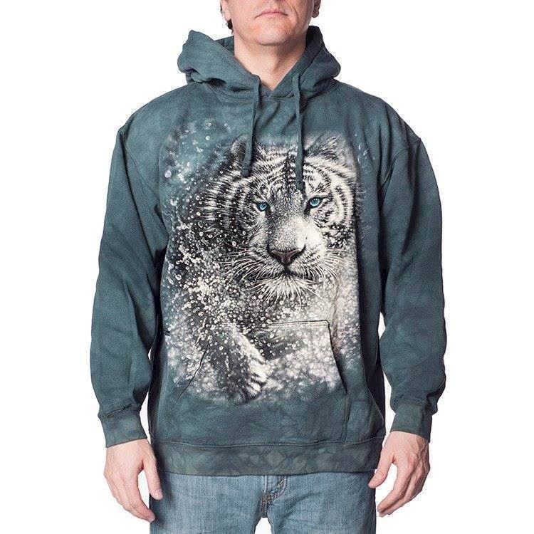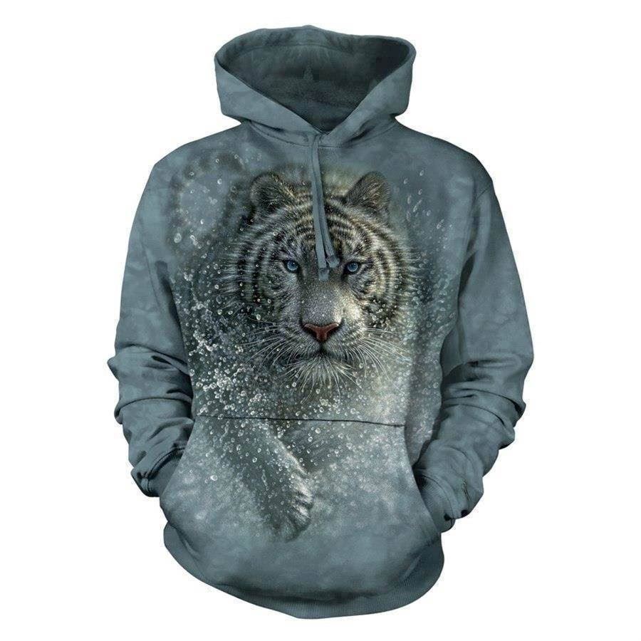 De fleste tigere kan godt lide vand og dette motiv har fanget et smukt billede af en hvid tiger, som løber igennem vandet. Blusen er lavet af en neutral farve og passer derfor til alt.