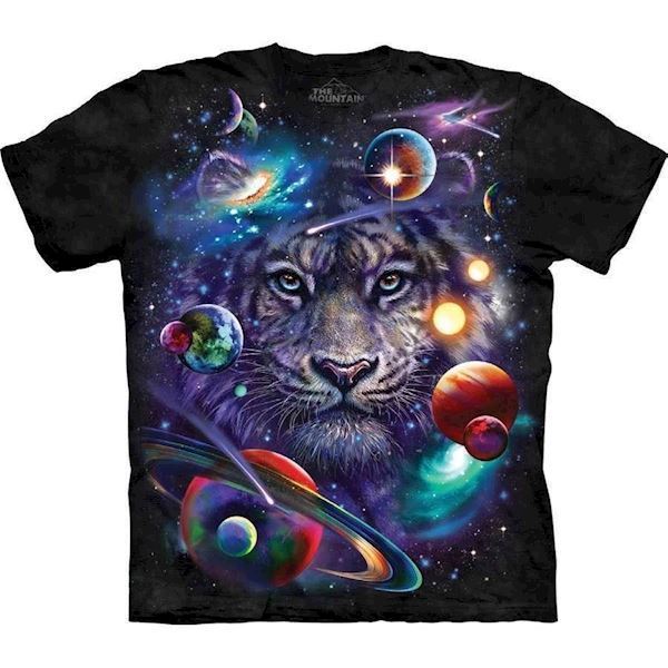 T-shirt med tiger på kosmisk baggrund. Så kan en sort t-shirt ikke blive mere farverig. Stærke farver til en stærk personlighed,