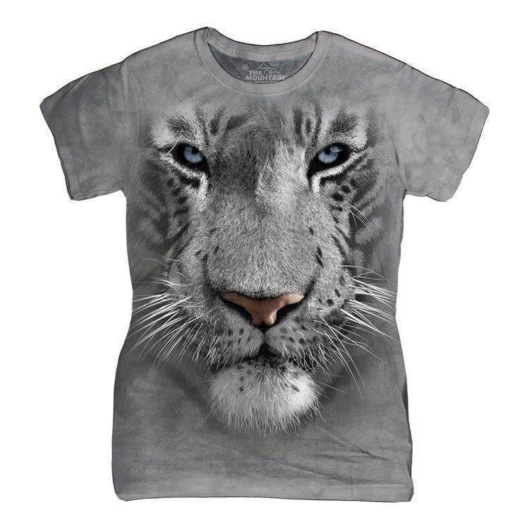 Et smukt motiv af en hvid tigers ansigt. T-shirtens baggrundsfarve har en hvid nuance, som gør det svært at tyde hvor tigeren starter og baggrunden slutter, hvilket giver et fedt udtryk.