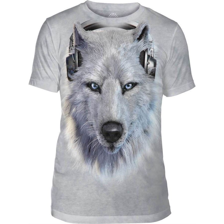 Triblend Tee med humoristisk ulvemotiv. Ulven på t-shirten har høretelefoner på - en rigtig musik ulv. Flot lys kortærmet bluse med smukt motiv.