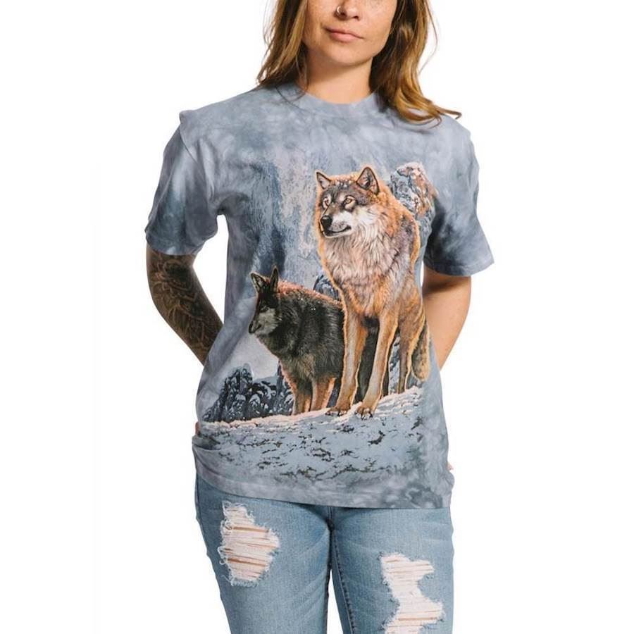 Fantastisk ulvemotiv på flot bjergside baggrund. Kortærmet bluse med naturtro ulve i sneen.