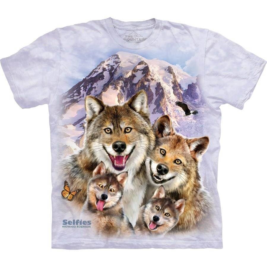 Sjiov trøje med motiv af en ulvefamilie, der har taget et "selfie". Den arktiske baggrund tyder på, at det er polarulve. De er i hvert fald søde.