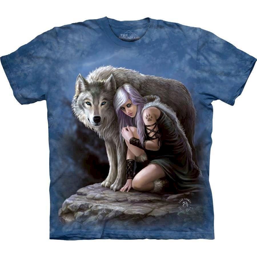 T-shirt med ulv, der beskytter en ung kvinde. Flot motiv på en blå baggrund. Historien bag pigen og ulven må du selv digte.