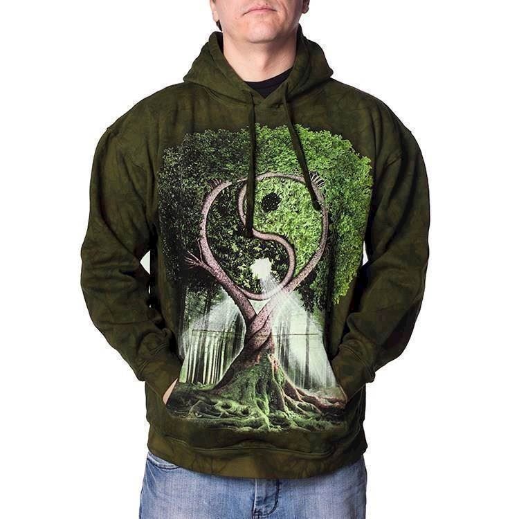 Superflot grøn hoodie med motivtryk af træ med grene i yin-yang-symbolets form. Lækkert og spirituelt motiv, og den rolige grønne farve passer til hvadsomhelst.