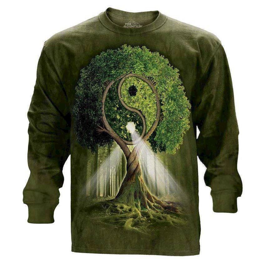 Superflot grøn langærmet trøje med motivtryk af træ med grene i yin-yang-symbolets form. Lækkert og spirituelt motiv, og den rolige grønne farve passer til hvadsomhelst.