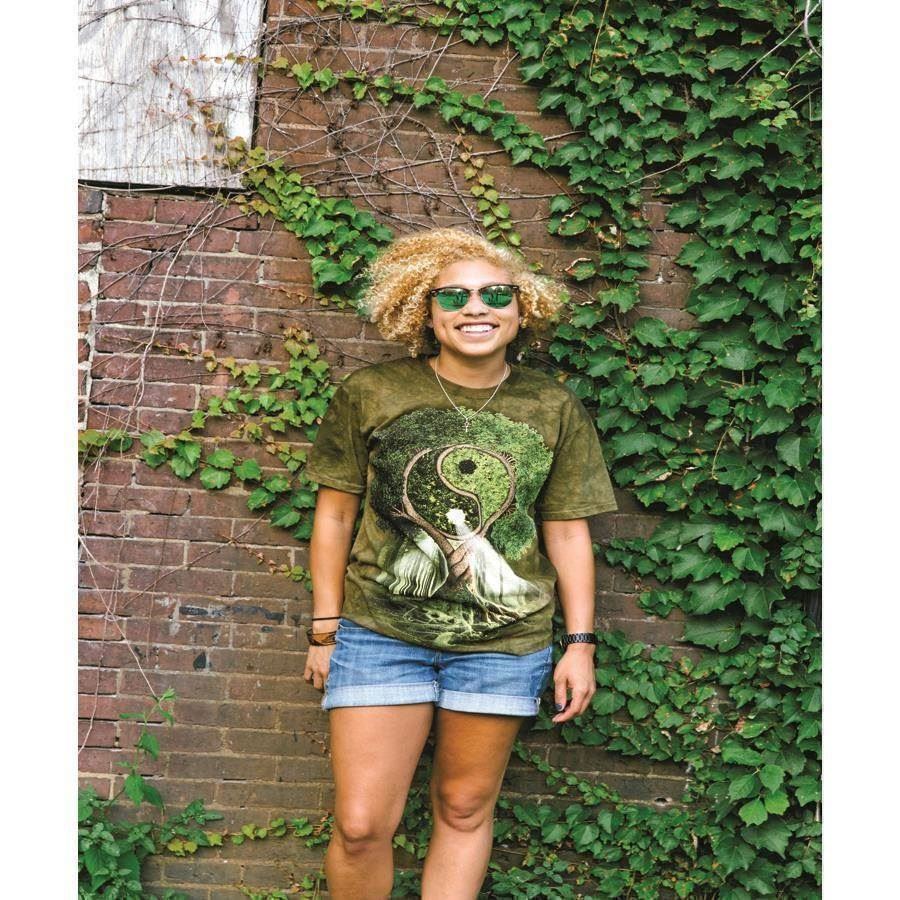 Superflot grøn t-shirt med tryk af et træ med grene i yin-yang-symbolets form. Lækkert og spirituelt motiv, og den rolige grønne farve passer til hvadsomhelst.