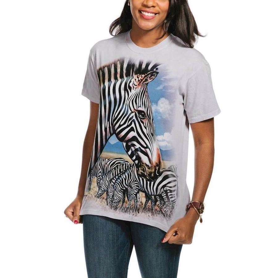 T-shirt med zebra. Den afrikanske hest med striber synes at være iøjefaldende, men dens striber gør det faktisk svært for rovdyr at bestemme hvor langt væk zebraen er, og hvad retning den vender. Hvis mange zebraer er i flok, kan det være svært for en løve at se andet end striber, så de har problemer med at vælge et dyr at jage.
